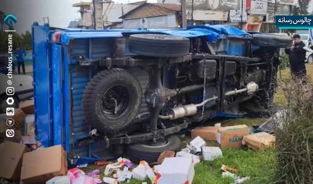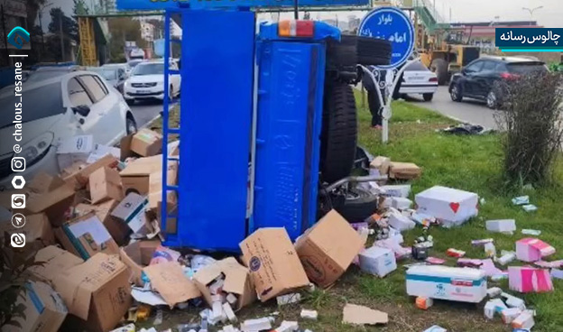 - یک دستگاه وانت نیسان که حامل بار کارتنهای مواد دارویی و بهداشتی بود، پس از برخورد واژگون شده و تمامی محموله آن در سطح معابر و فضای سبز حاشیه خیابان پخش شده است.